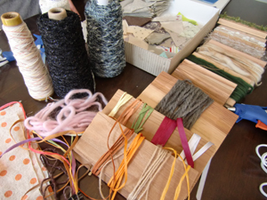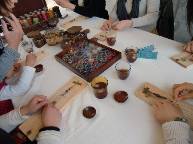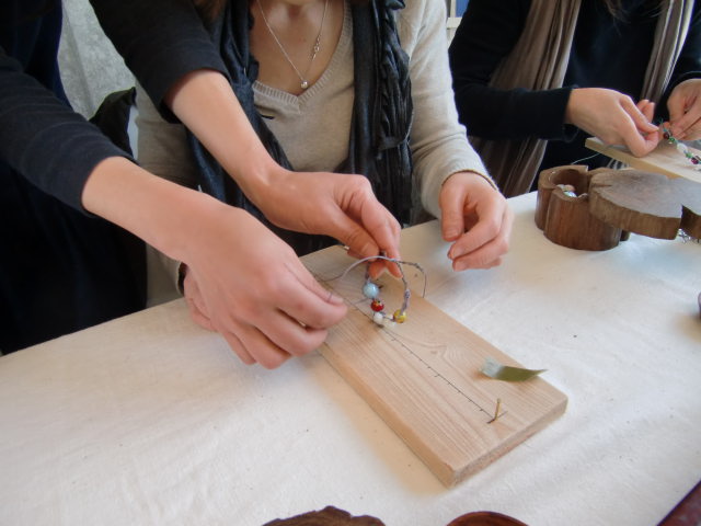 ひとつひとつ形の違う珍しい石、カラフルな麻糸などを並べて教室スタート。